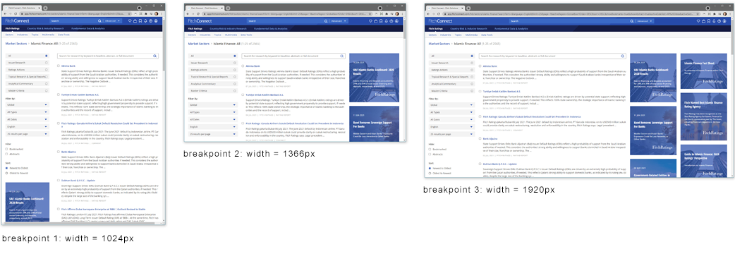 By the autumn of 2019, Mike and I enjoyed a loose charter from Product to improve the design of FitchConnect as a part of our regular work. We had updated the global header and footer with a more modern look-and-feel I designed ( see new header in below screenshot ). Mike and I joked that we had fixed “the bun” and now it was time to fix the burger. We started with the most used page layout on the site, what I’d named the “Research List View” — or RLV for short.